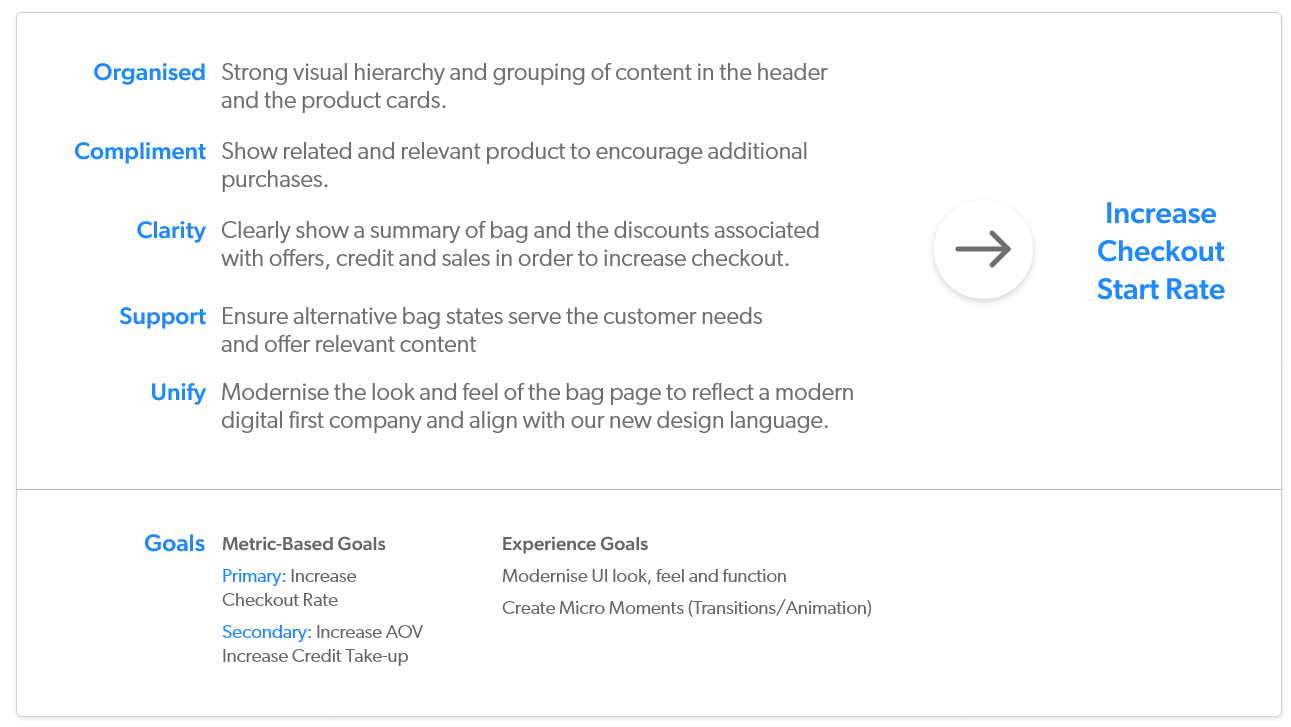 We established 5 design pillars for the project that we would work towards and that supported the primary goal of increasing checkout start rate.
