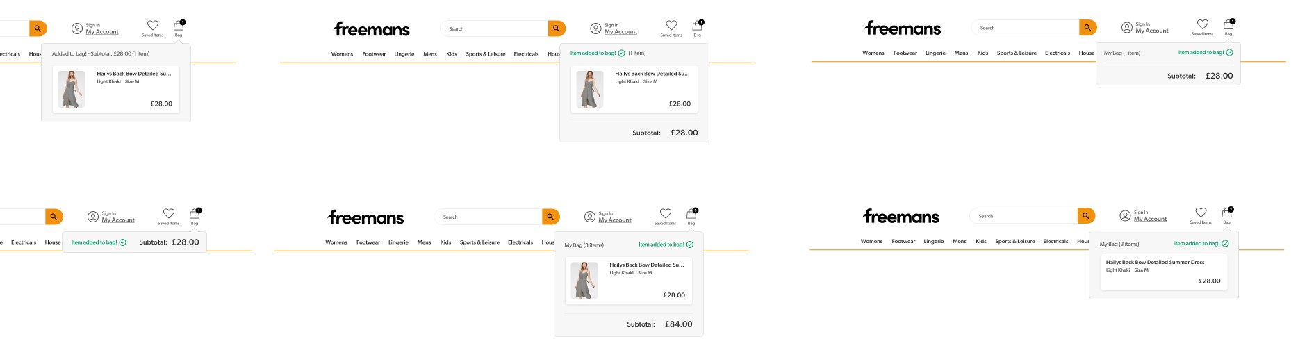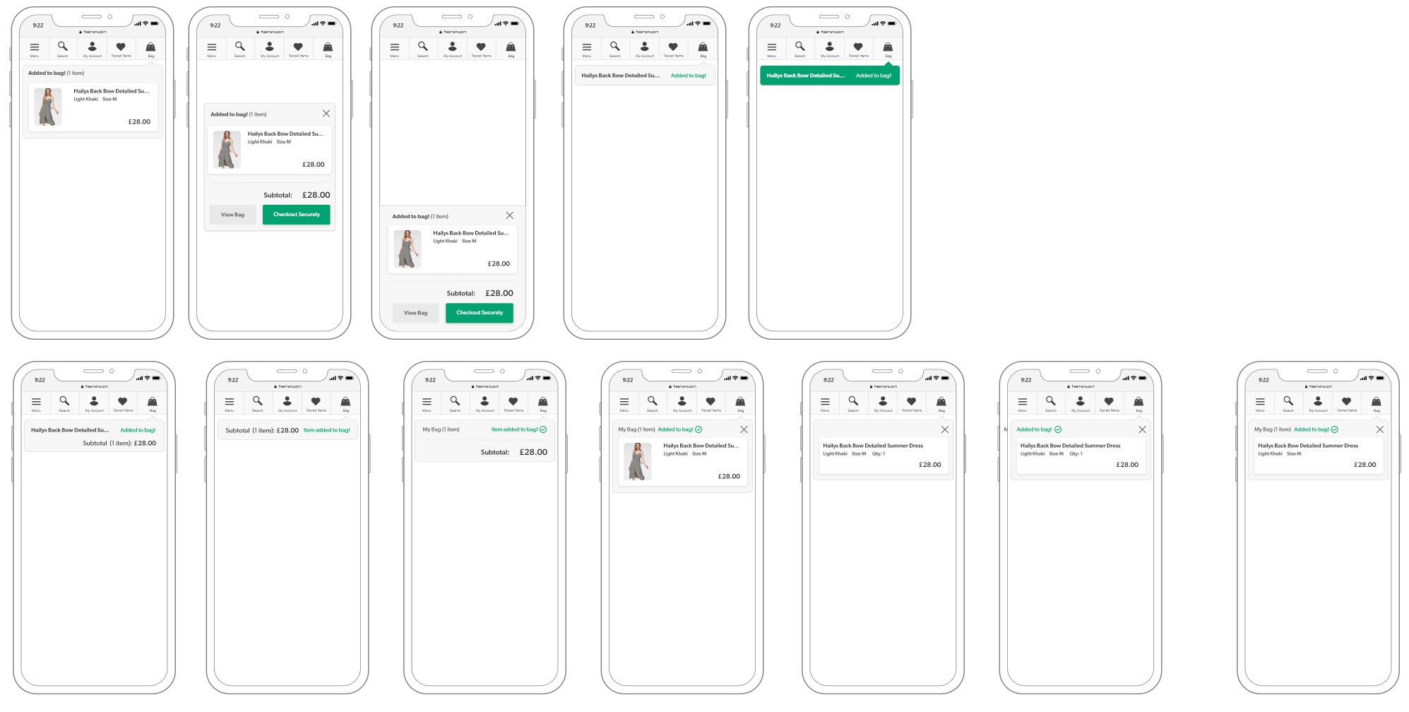 I considered variations on how the customer could be notified that the product had been added to bag without being too intrusive and disrupting their shopping experience.