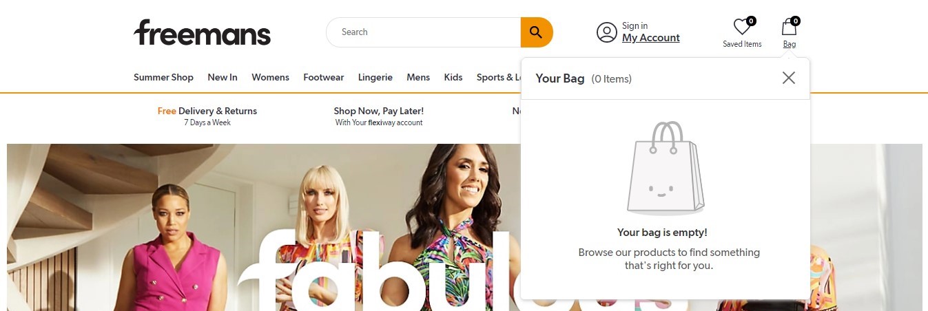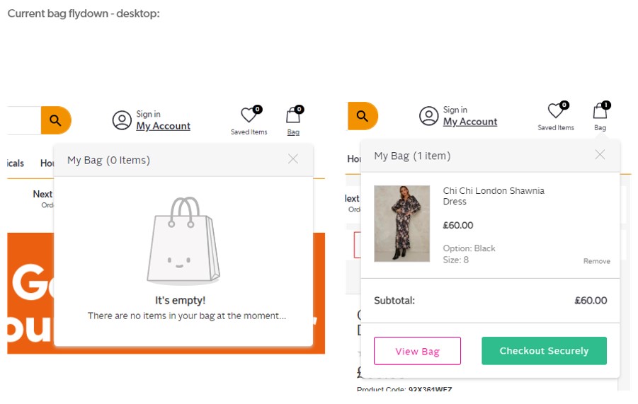 The solution designs were simplified as the general functionality of the empty states and bag flydown were appropriate. The main UX change was aligning the styling to match the new design language, bringing it into line with recent redesigns and maintaining customer confidence within the sites as they have a consistent visual experience.