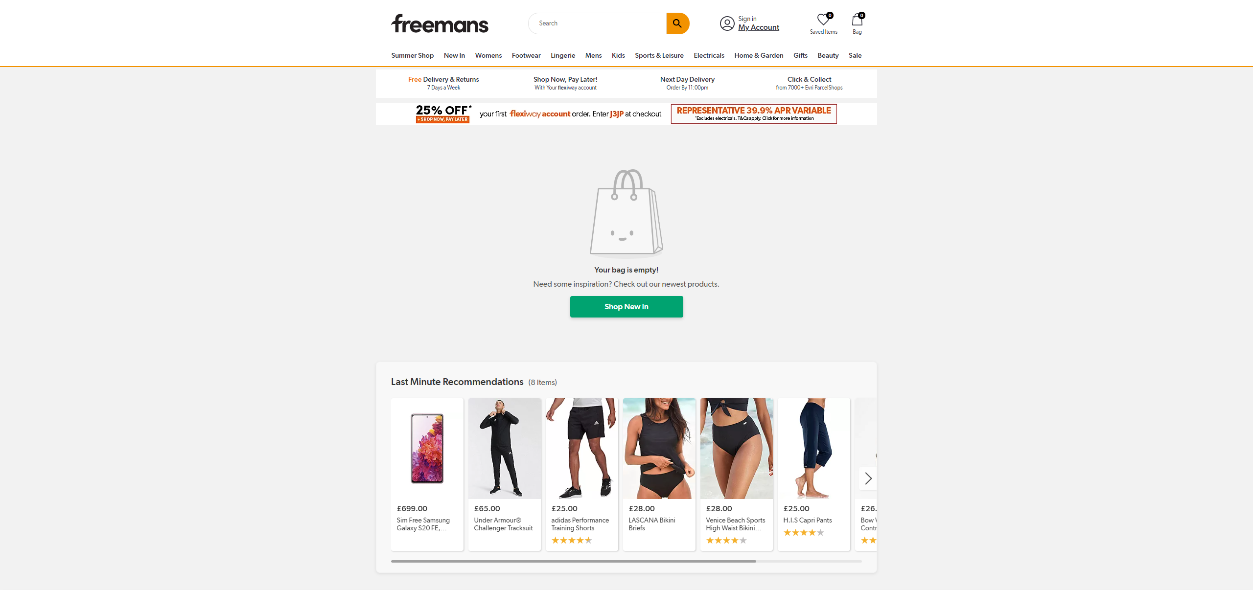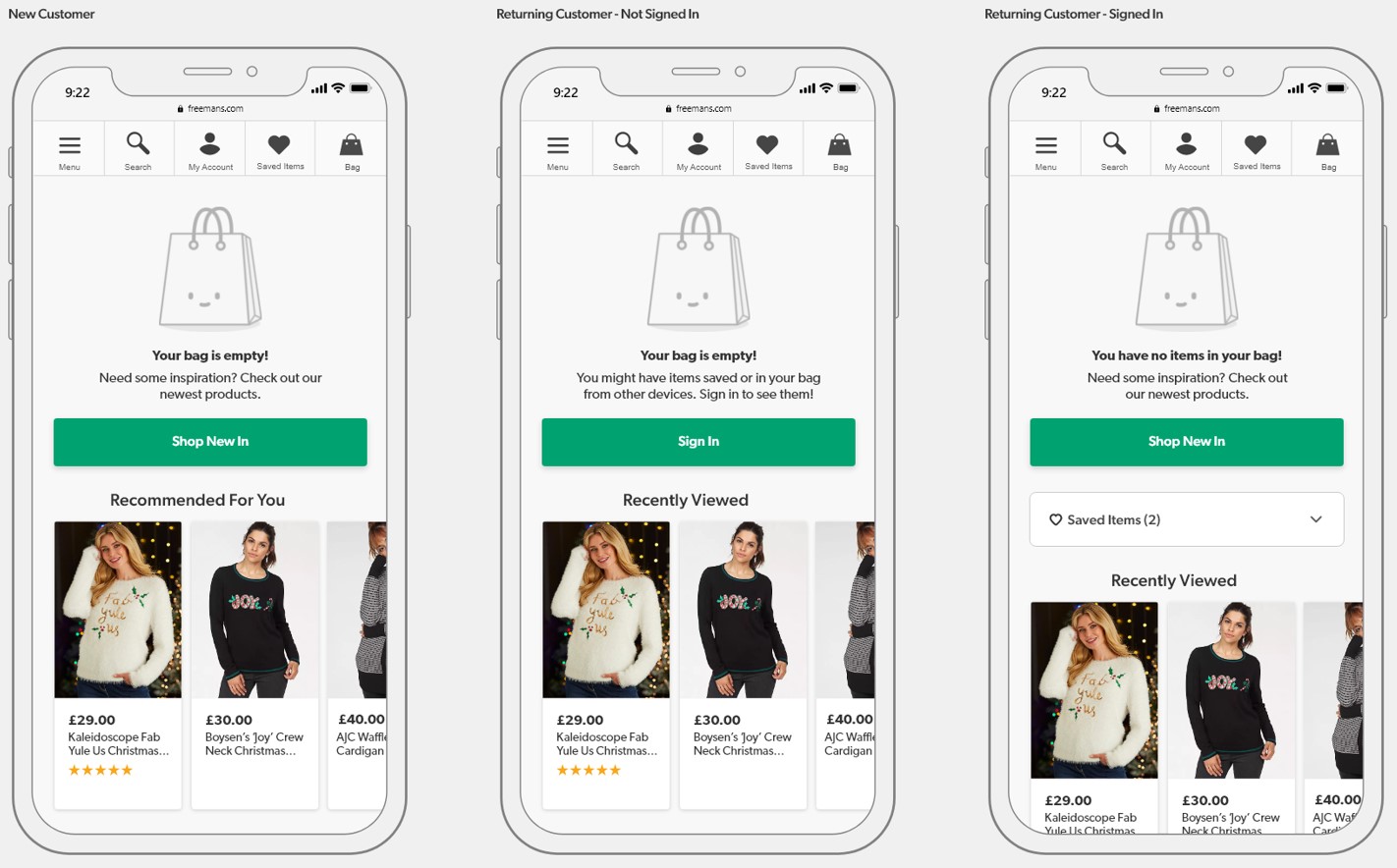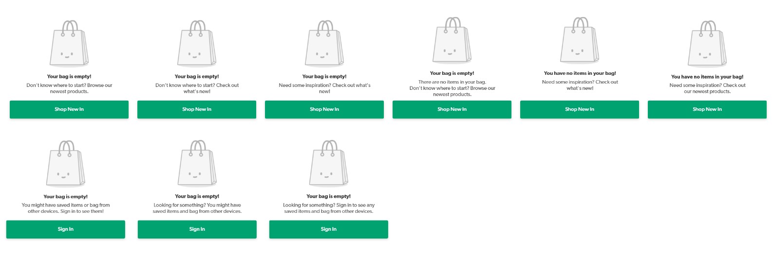 The empty bag states were amended with improved copy and call-to-actions that changed dynamically dependant on the type of customer and their cookie status.